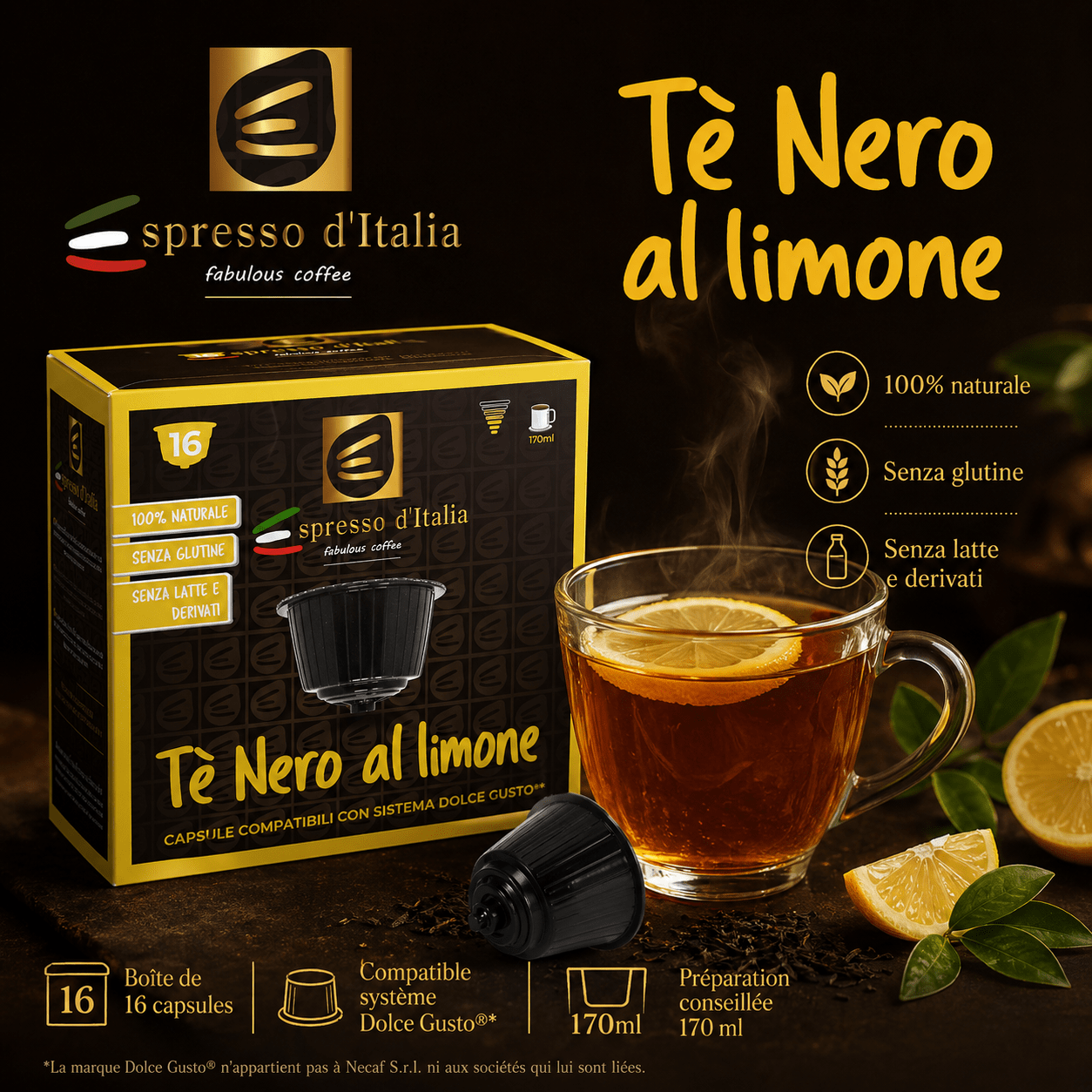 Découvrez le Tè Nero al Limone Espresso d’Italia, un thé noir aromatisé citron aux notes vives et rafraîchissantes, conditionné en capsules compatibles Dolce Gusto®. Une boisson tonique, élégante et 100% naturelle, parfaite pour une pause revigorante à tout moment de la journée.