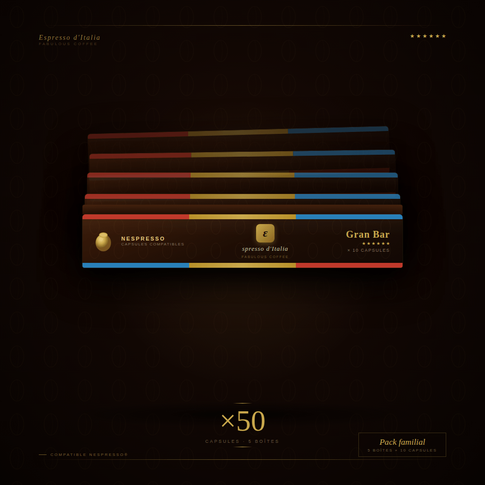 50 capsules compatibles Nespresso® Gran Bar — Espresso d’Italia. Le bon équilibre entre quantité et prix. Intensité 6/6, torréfaction italienne. Soit 0,34 € la capsule.
